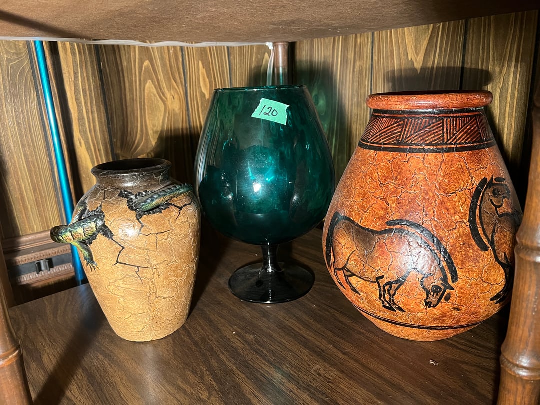 •Lg MCM Blue Pedistal Vase, (2) Pottery Vases (Lot #120)