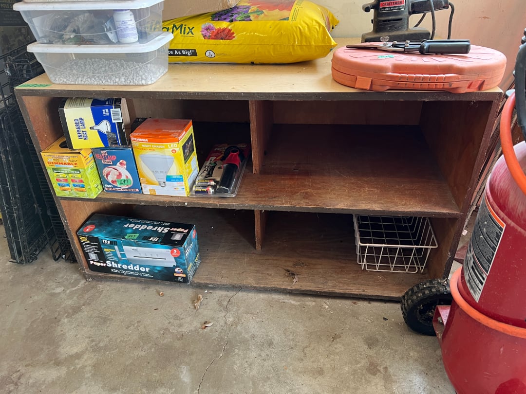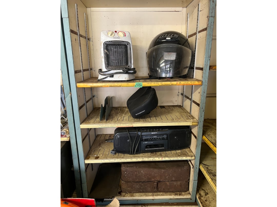 •Contents of 3 Shelves-Helmet,Bike Seat, Radio, (Lot #418)