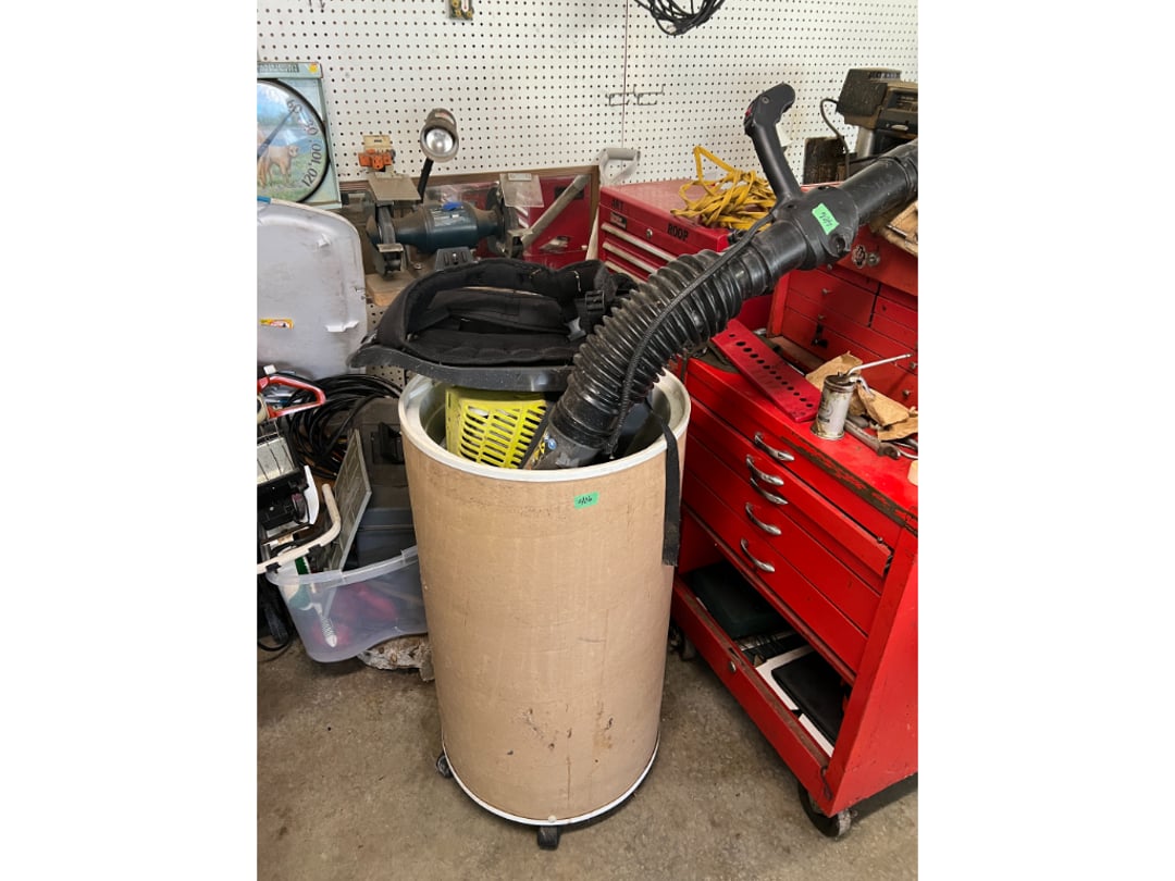 •Ryobi Backpack Blower & Barrel on Wheels (Lot #406)