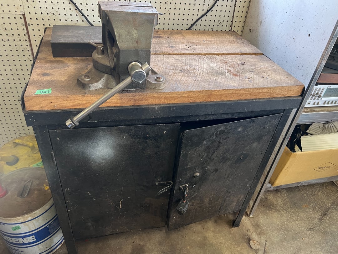 •Metal Cabinet w/Big #5 Vise, Pallet Rack Parts (Lot #424)