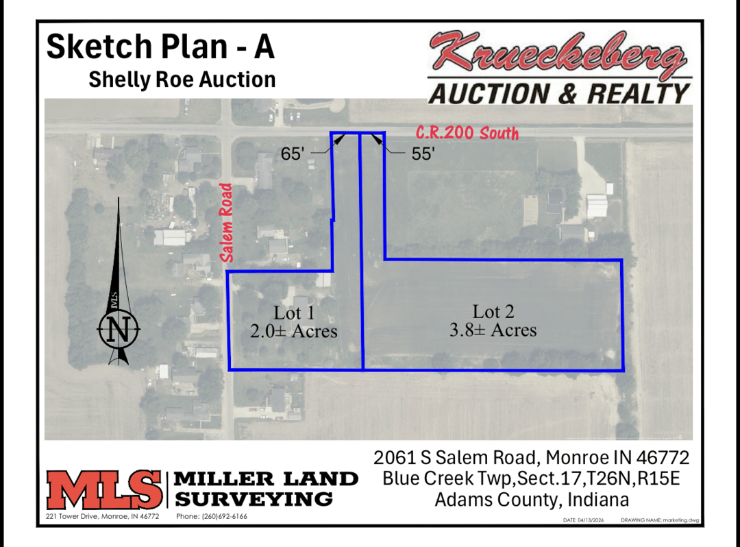 Auction Terms & Conditions Real Estate: Lot 1: $12,500 nonrefundable down payment, Lot 2: $7,500 nonrefundable down payment due at close of auction. Possession of Real Estate at closing, Tillable day of auction. Closing to be within 45 Days from date of auction. Taxes Prorated to date of closing, estimated annual taxes 2026 payable 2027 Lot 1: $1,240.02 Lot 2: $109.86 A Staked Survey To be Split 50/50 between buyer & Seller, Title search, title policy, closing cost to be split 50/50 between buyer and seller. Not Sold Subject to Inspections, please have inspections done Prior to day of auction Sold AS/IS WHERE/IS. Sold Subject to Sellers approval. Not Responsible for accidents. Auctioneers License: Josh Krueckeberg (AU19800008 AC31500055)